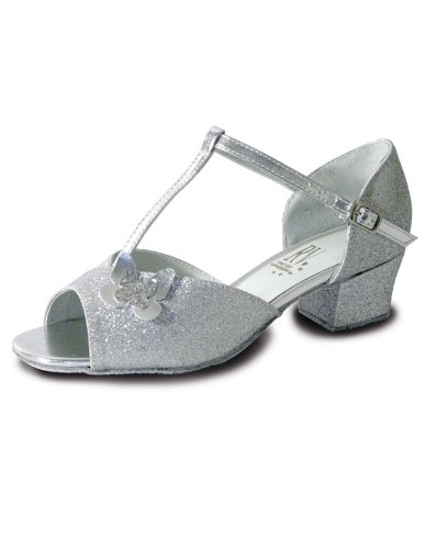From Roch Valley comes the beautiful Carrie Children's Ballroom Shoe. These adorable girls ballroom shoe are made with silver glitter PU and feature a T-Bar strap, Cuban heel, and Butterfly motif. Perfect for baby ballroom or simply as party shoes, the Carrie children's ballroom shoes are irresistably cute.